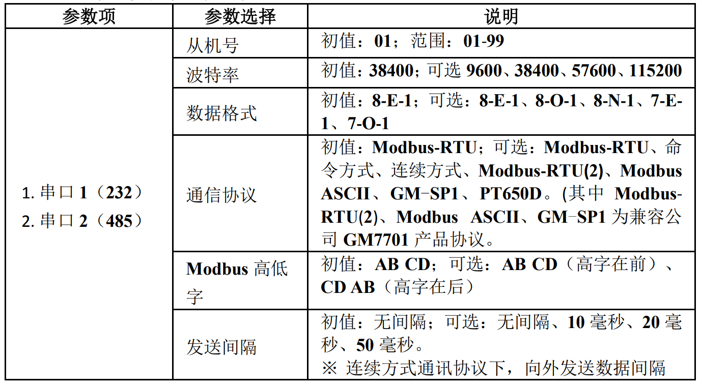 GM7702稱重變送器提供 RS232、RS485 串行口輸出功能。串口支持協(xié)議:Modbus-RTU 協(xié)議、命令方式(r-SP1)、連續(xù)方式(r-Cont)。