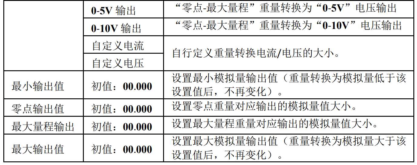 ⑴電壓輸出型可選擇 0~5V、0~10V 模擬量輸出,即儀表將實(shí)時(shí)顯示及輸出重量值轉(zhuǎn)換為電壓模擬量輸出的對(duì)應(yīng)值。