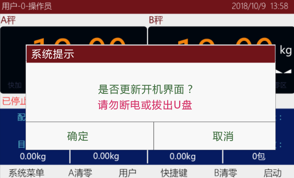 1.2 按系統(tǒng)提示點擊“開機界面更新”。則系統(tǒng)提示框內(nèi)容會變成“是否更新開機界面! 確定,取消”。