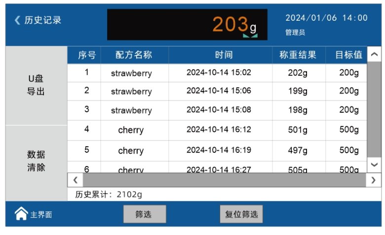 ● 歷史數(shù)據(jù)記錄:支持400萬條歷史數(shù)據(jù)記錄,支持按時間、配方名篩選歷史數(shù)據(jù)記錄,并實時輸出配方名稱、時間、稱重結果、目標值、上限值、下限值參數(shù),方便存檔與查閱;