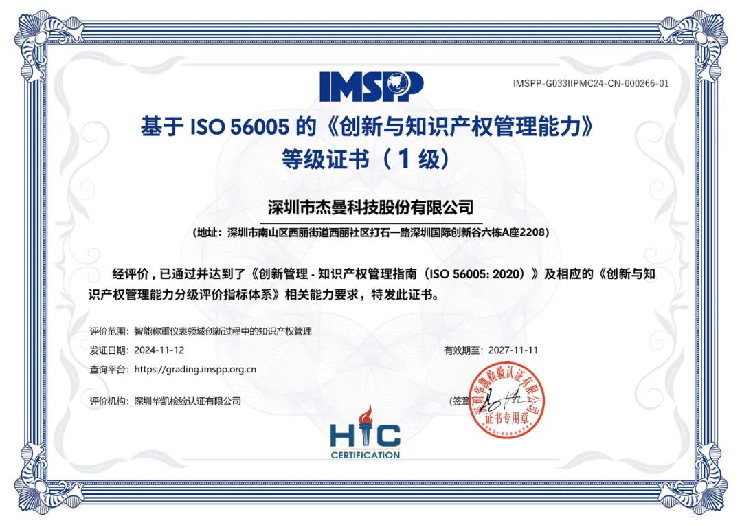 2024年5月,杰曼科技正式啟動(dòng)分級(jí)評(píng)價(jià)工作,按照《創(chuàng)新管理知識(shí)產(chǎn)權(quán)管理指南(ISO 56005:2020)》相關(guān)《創(chuàng)新與知識(shí)產(chǎn)權(quán)管理能力分級(jí)評(píng)價(jià)指標(biāo)體系》的能力要求,全面評(píng)估了公司在戰(zhàn)略管理能力、創(chuàng)新能力、知識(shí)產(chǎn)權(quán)運(yùn)用等多項(xiàng)方面表現(xiàn)。在華凱審核組的協(xié)助下,杰曼科技順利貫徹落實(shí)了ISO 56005國(guó)際標(biāo)準(zhǔn),建立了完善的創(chuàng)新與知識(shí)產(chǎn)權(quán)管理體系,并完成了試運(yùn)行。于近日順利斬獲ISO56005【創(chuàng)新與知識(shí)產(chǎn)權(quán)管理能力】權(quán)威認(rèn)證。