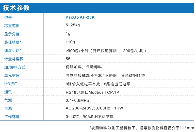 PaxGo系列—AF-25K通用版包裝單元是一款智能定量稱重包裝頭,它的自適應參數(shù)調(diào)節(jié)功能可以精準控制包裝物料的流量,實現(xiàn)精準高速包裝,無需人工調(diào)節(jié)參數(shù),廣泛應用于化工、糧食等行業(yè)的顆粒物料定量包裝設備。
