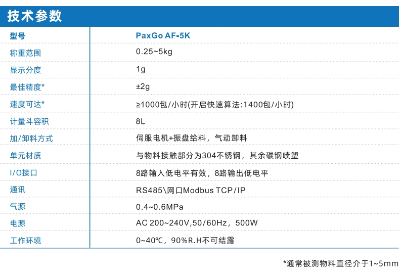 PaxGo系列—AF-5K通用版包裝秤單元是一款智能定量稱(chēng)重包裝頭,它的自適應(yīng)參數(shù)調(diào)節(jié)功能可以精準(zhǔn)控制包裝物料的流量,實(shí)現(xiàn)精準(zhǔn)高速包裝,無(wú)需人工調(diào)節(jié)參數(shù),廣泛應(yīng)用于化工、糧食等行業(yè)的顆粒物料定量包裝設(shè)備。