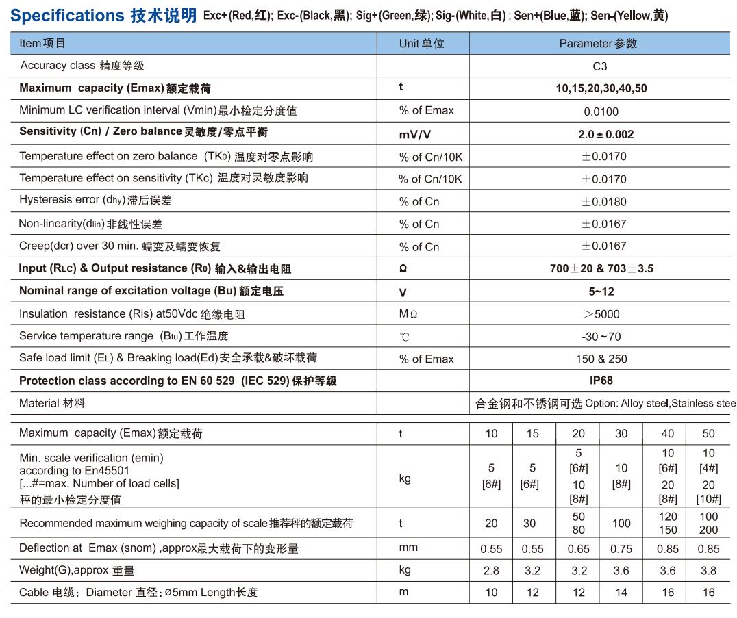 該稱重傳感器結(jié)構(gòu)緊湊,安裝簡便,激光焊接IP68,自復(fù)位功能;經(jīng)過角差預(yù)調(diào)整適合并聯(lián)使用(按EN 45 501);合金鋼和不銹鋼材質(zhì)可選。杰曼科技稱重傳感器堅固耐用,設(shè)計精良的稱重傳感器,精度最高可達(dá)C3等級,能夠保證高度精確可靠的數(shù)據(jù),用于需要精確測量的多種行業(yè)中,避免產(chǎn)品浪費(fèi),節(jié)約成本。功能用途:廣泛適用于臥罐秤、筒倉秤等稱重設(shè)備。