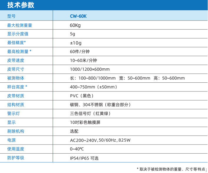 ● 高精度大量程:稱重范圍廣至5~60kg,檢重精度高達(dá)±10g*;