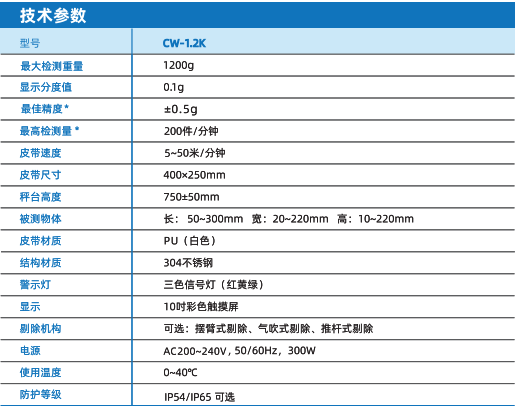 CW-1.2K在線檢重秤是一款高速精準、穩(wěn)定可靠的自動檢重秤,全觸摸屏使得CW-1.2K檢重秤操作簡易,對外擴展IO輸入輸出口及對外串口網(wǎng)口通訊實現(xiàn)了產(chǎn)品的多點控制、監(jiān)測及遠程控制,適用于檢測、計數(shù)和分選100~1200g包裝產(chǎn)品(箱裝、桶裝、袋裝)或加工的部件,產(chǎn)品操作簡單明了,日常維護方便,廣泛應(yīng)用于糧食、種子、化工、建材等稱重設(shè)備行業(yè)。